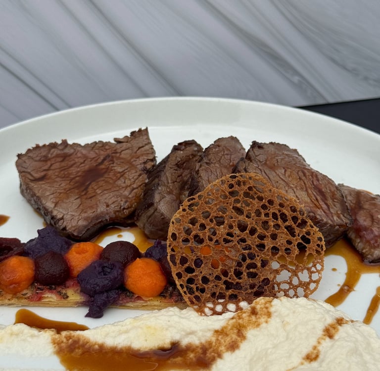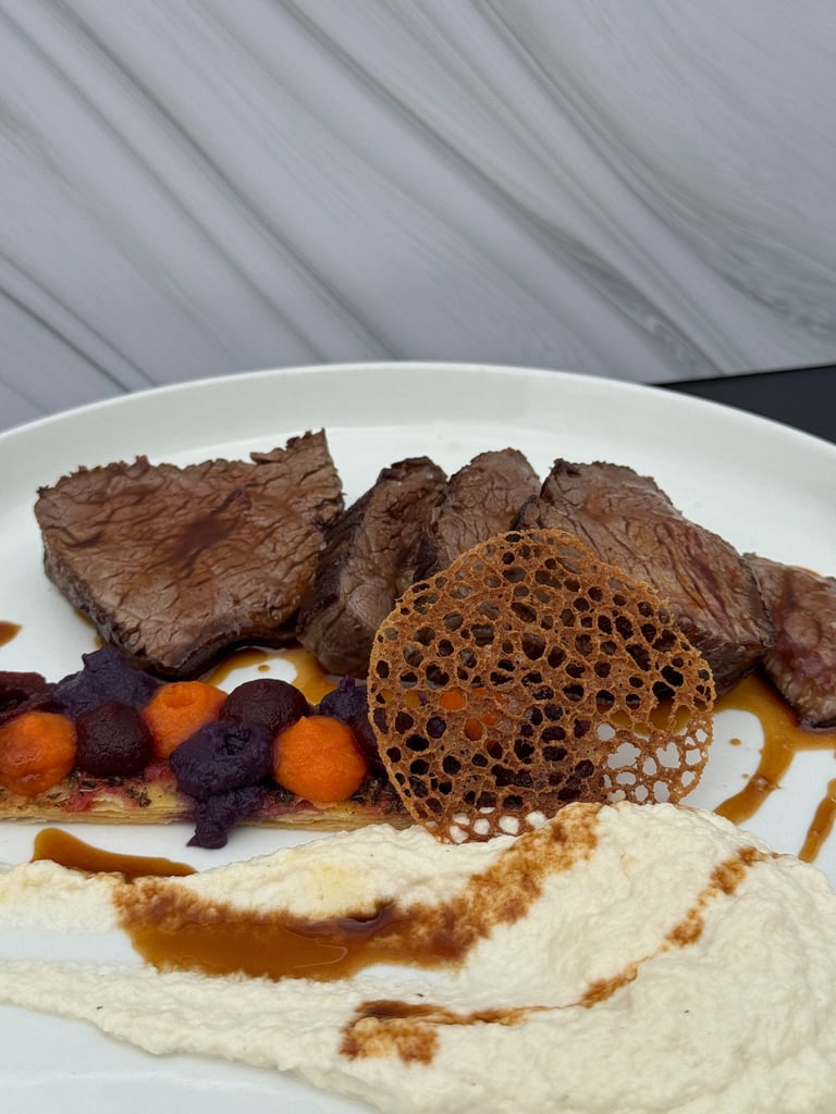 Onglet de boeuf servi saignant - compoté de chou frisé et épinard - légumes marinés - citron confits - pesto de pistache